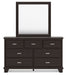 Feast your eyes on this richly versatile dresser with mirror. Its traditional-inspired dark brown finish effortlessly blends with contemporary bright nickel-tone pulls to create a stunning look that's not too stuffy or too trendy. Spacious drawers offer plenty of storage for your wardrobe and spare bed linens. The mirror is a handsome reflection of classic-meets-modern design.