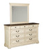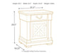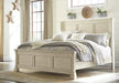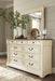 Dressed to impress, this 5-piece bedroom set exudes a mix of styles, including shabby chic, casual cottage and a touch of down home country. The textured antique white finish works with shelter style headboard with lattice design for a vintage look. The nightstands' two-tone, gently distressed finish pairs weathered oak with antique white for quaint character. Each nightstand includes a crossbuck adorned storage cabinet, felt-lined drawer with dovetail construction and pair of power outlets and USB charging ports for added convenience. Mattress and foundation/box spring available, sold separately.
