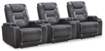 Family movie nights will be forever changed with this 3-piece power recliner set. The adjustable Easy View™ headrest allows a primo view of the TV no matter how far back you recline and the extended ottoman provides extra room to really stretch out. Ultra-cool lattice stitching elevates the look and ambient LED lighting completes the theater-style experience. So relax, kick off your shoes and enjoy the show.