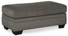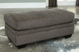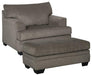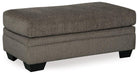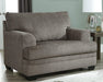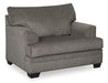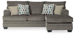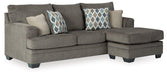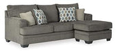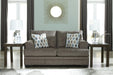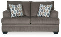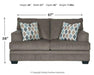This contemporary sofa and loveseat set has comfort written all over it. From the plush cushions to the textured gray fabric, it’s a total winner for relaxation. Designer throw pillows in blue, brown and tan complement the neutral upholstery.