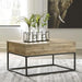 This occasional table set offers a fresh take on urban style with a casual lift-top coffee table design and replicated butcher block finish. The metal base elevates this ensemble and provides open space to add a lightness to your room.