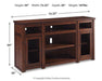 Whether your style is contemporary or more traditional, this TV stand with fireplace insert is beautifully in tune—thanks to clean, straightforward lines and a simply striking presence. Its hearty profile is enhanced by mango veneers, so rich and earthy. What really turns up the heat: an electric infrared fireplace insert with faux firebrick surround that operates with or without infrared heat and includes a multi flame feature, 7-level temperature setting, five brightness levels and an LED glowing embers effect.