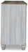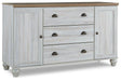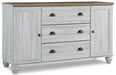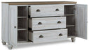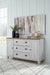 Beautifully simple yet rich with character, this bedroom dresser and mirror is a dream come true. It masters the art of simplicity with a charming two-tone look of weathered white complemented by a replicated oak grain. Three spacious drawers and two doors with adjustable shelves provide plenty of room for folded clothes and fashion accessories. Bun feet add a distinctive look, while dark bronze-tone hardware is a brilliant finishing touch. If farmhouse style is calling your name, answer with this timeless treasure