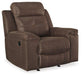 Rustic character comes forth in this dark gray rocker recliner. Designer stitching adds a fashion-forward touch to the soft cushions. Faux suede fabric speaks to your knack for superior-quality materials. High back provides ample support as you get off your feet for a bit. With just one pull of tab, you’ll be easing back into relaxation. Infinite levels of comfort await.