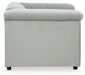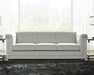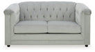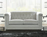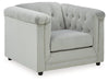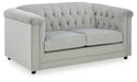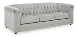 With a timeless classic Chesterfield styling that's very much in vogue, this seating package makes a brilliant statement. Its beautifully neutral silvery gray velvet fabric looks as good as it feels. Nailhead trim, button tufting and high shelter arms give the set an effortlessly elegant appeal. The hidden leg design is an on-trend addition for modern spaces.