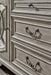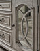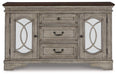 Serve up a sense of traditional cottage design with this dining room server. It features a pair of cabinet doors with inset mirrored glass and decorative fretwork. The server's three smooth-gliding drawers with dovetail construction and black felt bottoms are perfect for storing more delicate items. An antiqued gray body and rich deep walnut brown top, along with bail pulls and knobs finished in a dark bronze tone, complete the beautiful design.